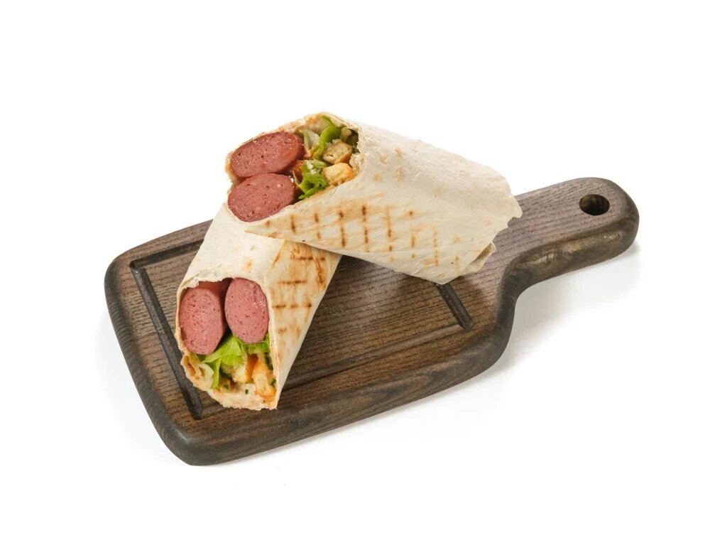 Хрустящий салат Айсберг, две сочные охотничьи сосиски, золотистый картофель Фри, соус «Спитак» и Кармир