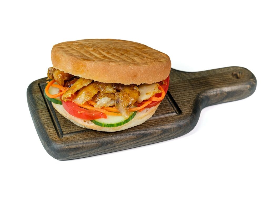 Сэндвич с сочной курицей и овощами. Хрустящая булочка, свежие овощи - помидоры и огурцы, а также пряная морковь по-корейски. Особую пикантность вкусу придают два соуса: сырный и спитак