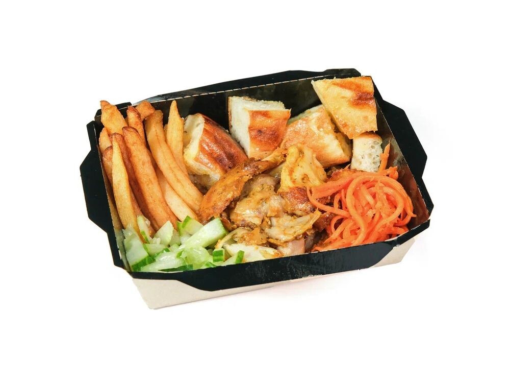 Сочное куриное филе приготолвеное на пару . Ароматные дольки булки с хрустящими свежими огурцами и золотистым картофелем фри. маринованная морковь по-корейски, фирменный соус «Спитак»