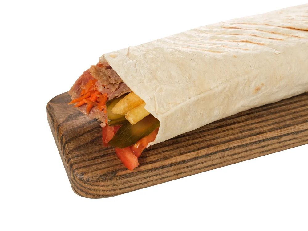 Нежный тонкий лаваш с сочной свининой приготовленной на пару , хрустящим картофелем фри и свежими помидорами. Пикантные соленые огурчики и морковь по-корейски создают яркий контраст. Соус «Спитак» завершает эту гармонию!