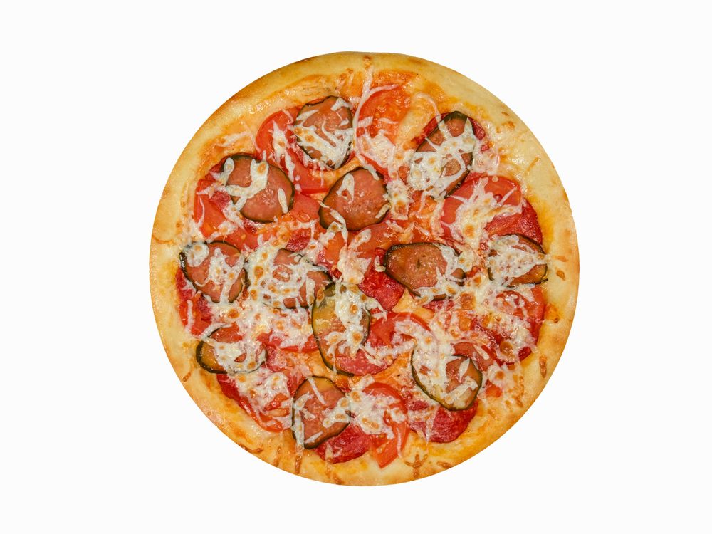 Моцарелла, колбаса Пепперони, помидоры, малосольные огурцы, томатный соус