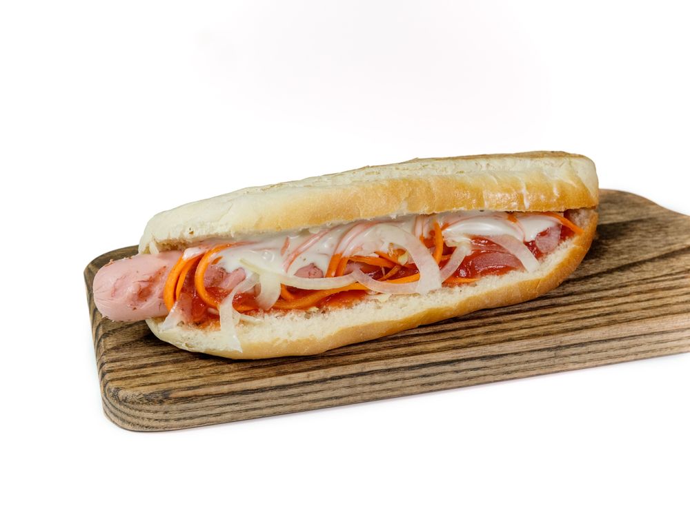 Говяжья сосика , хрустящя булка . Особый вкус и пикантность этому хот-догу придаёт морковь по-корейски, а также соус Спитак и Кармир . Лук добавляет сладости и хруста