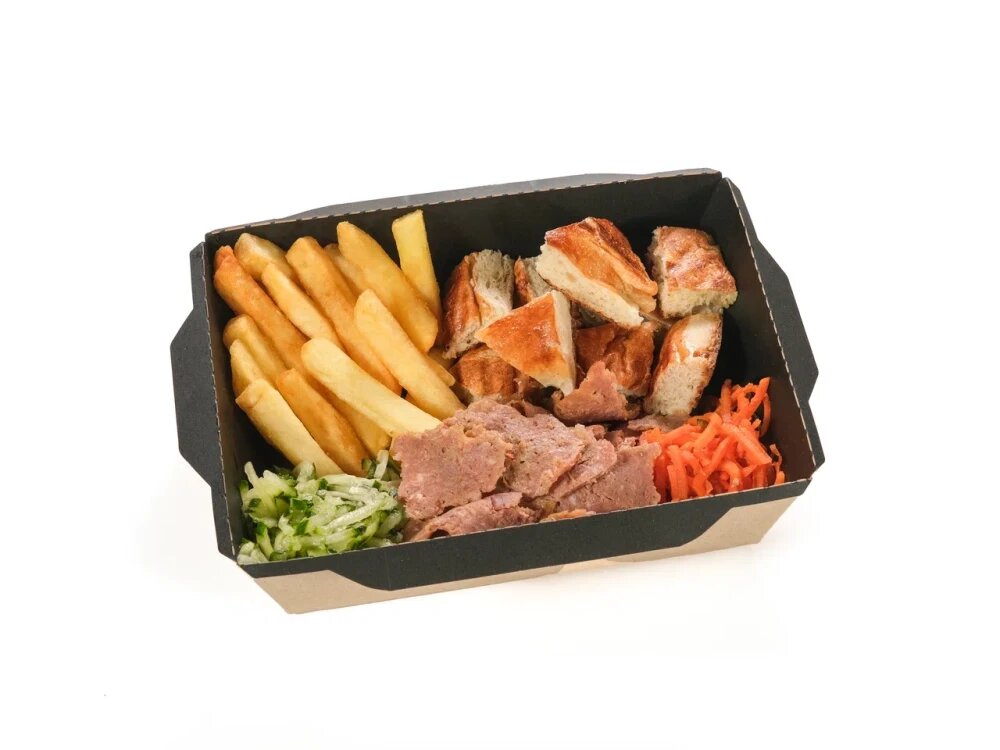 Сочный говяжий фарш приготолвеный на пару . Ароматные дольки булки с хрустящими свежими огурцами и золотистым картофелем фри. маринованная морковь по-корейски, фирменный соус «Спитак»